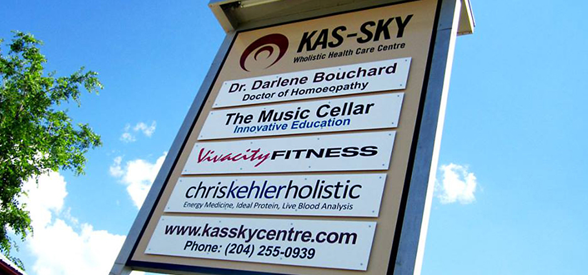 Kas-Sky Wholistic Health Care Centre houses many different alternative health care modalities/businesses within their centre. They needed an eye-catching sign that would serve as the main landmark for their clients.